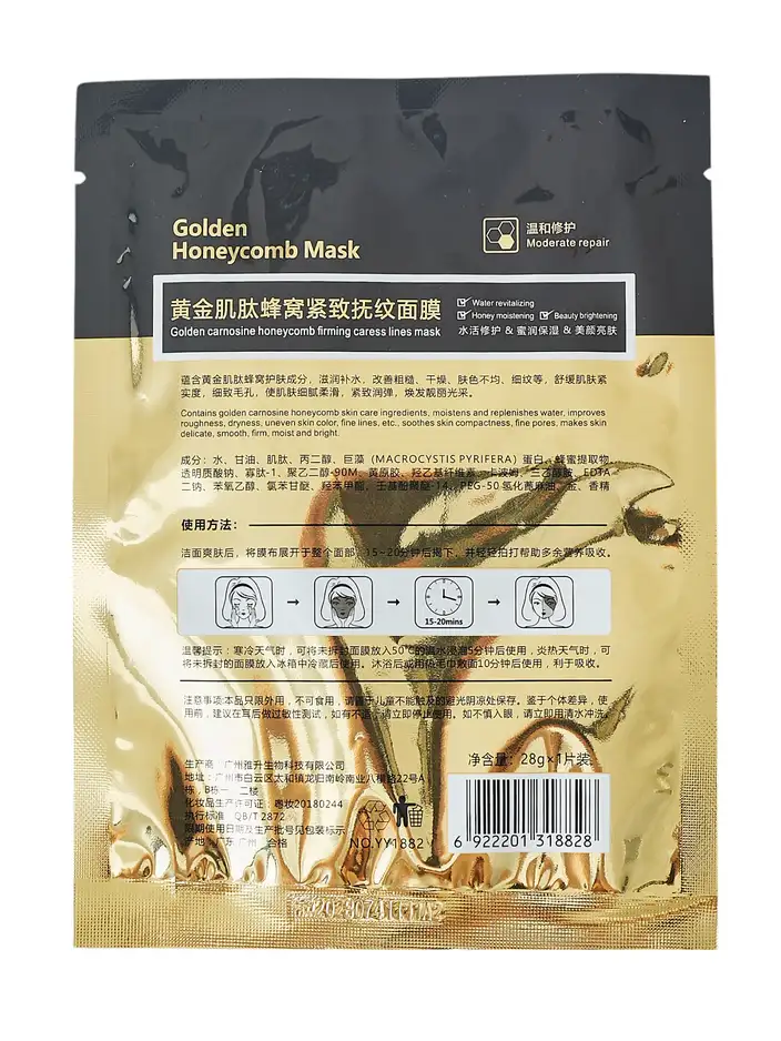 - Maska de față din aur cu structură de fagure hidratează, hrănește și regenerează pielea, lăsând-o netedă, radiantă și plină de strălucire.