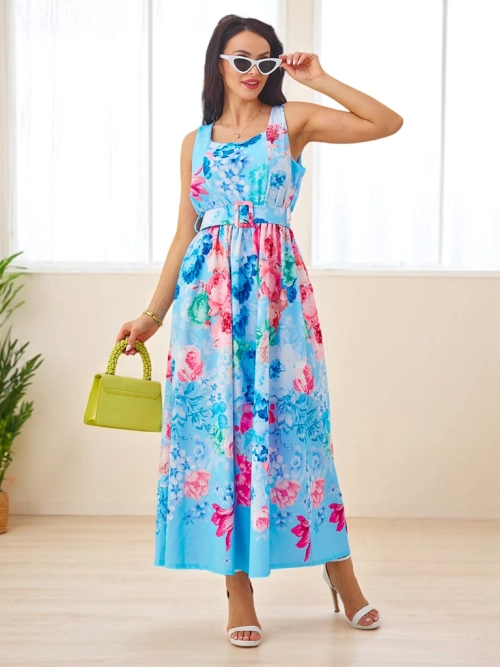 Rochie midi din viscoză pentru femei cu bretele, având un centură în diferite modele florale