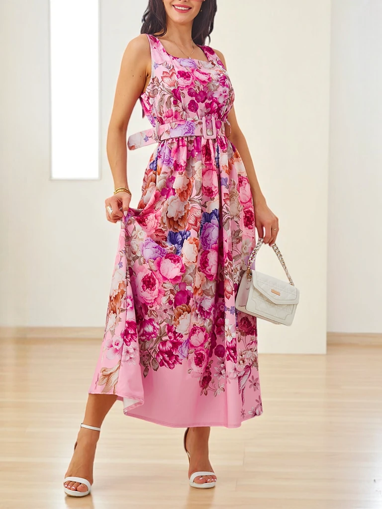 Rochie midi Royalfashion pentru femei cu bretele, având un cordon în diverse motive florale
