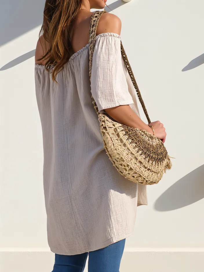 - Bluză elegantă din bumbac pentru femei în stil spaniol cu butoane decorative subtile. Perfectă pentru zilele călduroase, combină confortul cu un stil feminin și romantic.