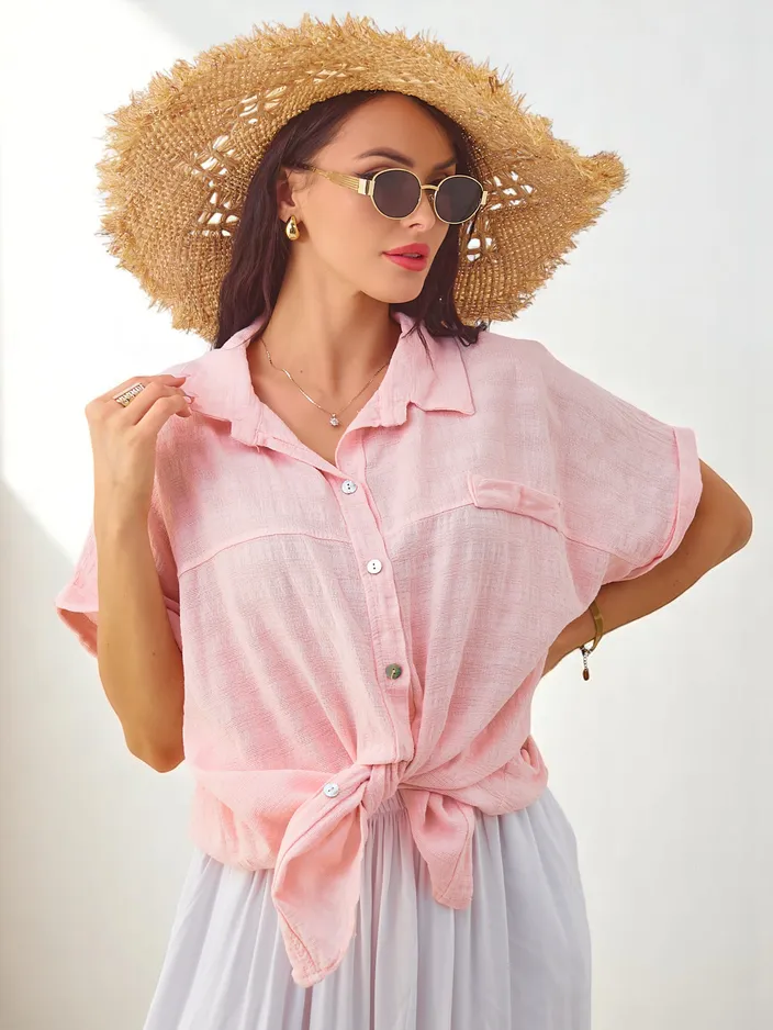 - Cămașă din bumbac pentru femei cu embosare și mâneci scurte. Model cu decolteu în V, design cu nasturi. Un articol esențial în garderoba oricărei femei!
