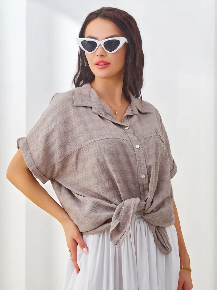 - Cămașă din bumbac pentru femei cu embosare și mâneci scurte. Model cu decolteu în V, design cu nasturi. Un articol esențial în garderoba oricărei femei!