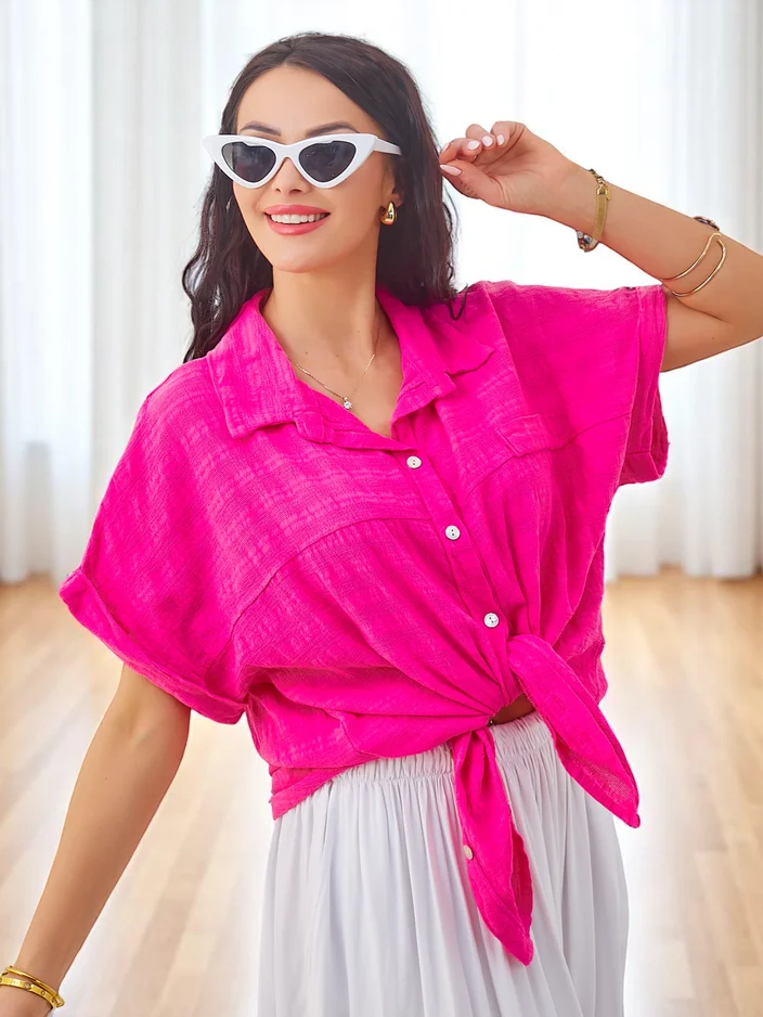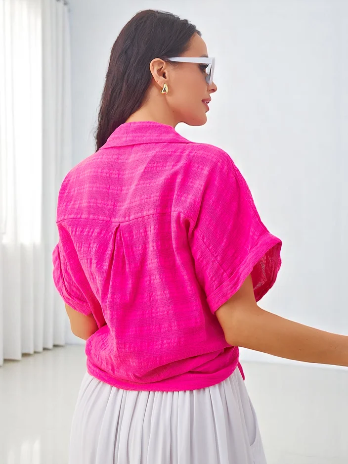 - Cămașă din bumbac pentru femei cu embosare și mâneci scurte. Model cu decolteu în V, design cu nasturi. Un articol esențial în garderoba oricărei femei!