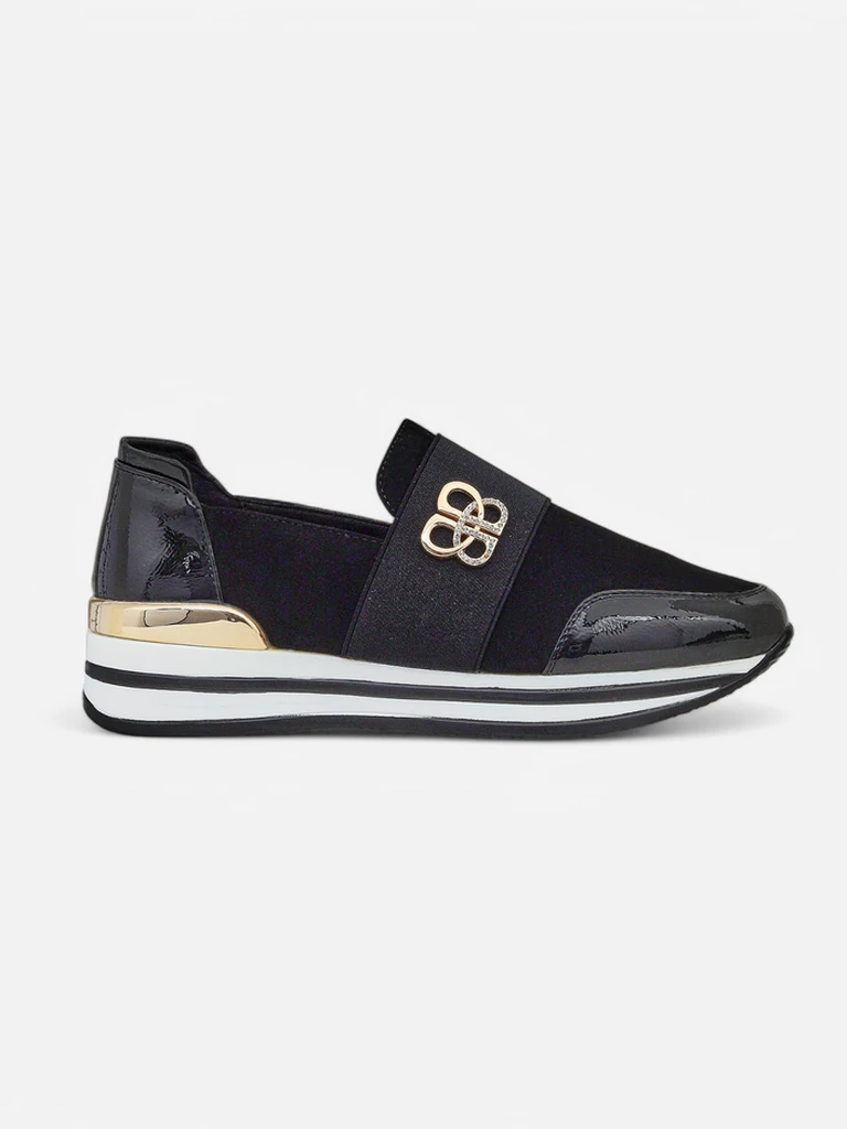 Slip-onnan di hende muhé Elektra Nero ku aksento di oro, kuero ekológiko, 3.5cm