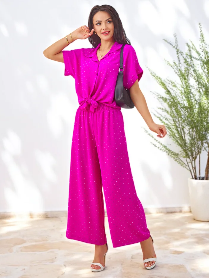 Royalfashion Set femei cu cămașă cu mânecă scurtă legată și pantaloni evazați cu strassuri