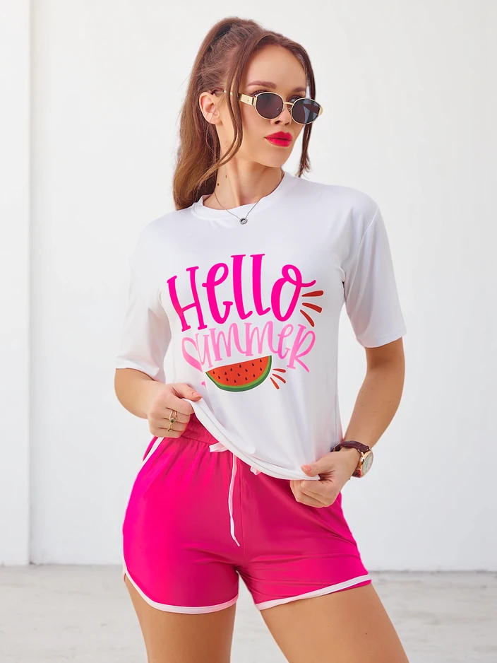 Royalfashion Set sportiv pentru femei cu tricou și pantaloni scurți Hello Summer