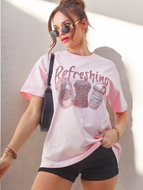 - Tricou din bumbac pentru femei cu un imprimeu împodobit cu cristale, combinând confortul cu un strălucire subtilă. Perfect pentru stiluri casual, adaugă un farmec unic oricărei ținute.