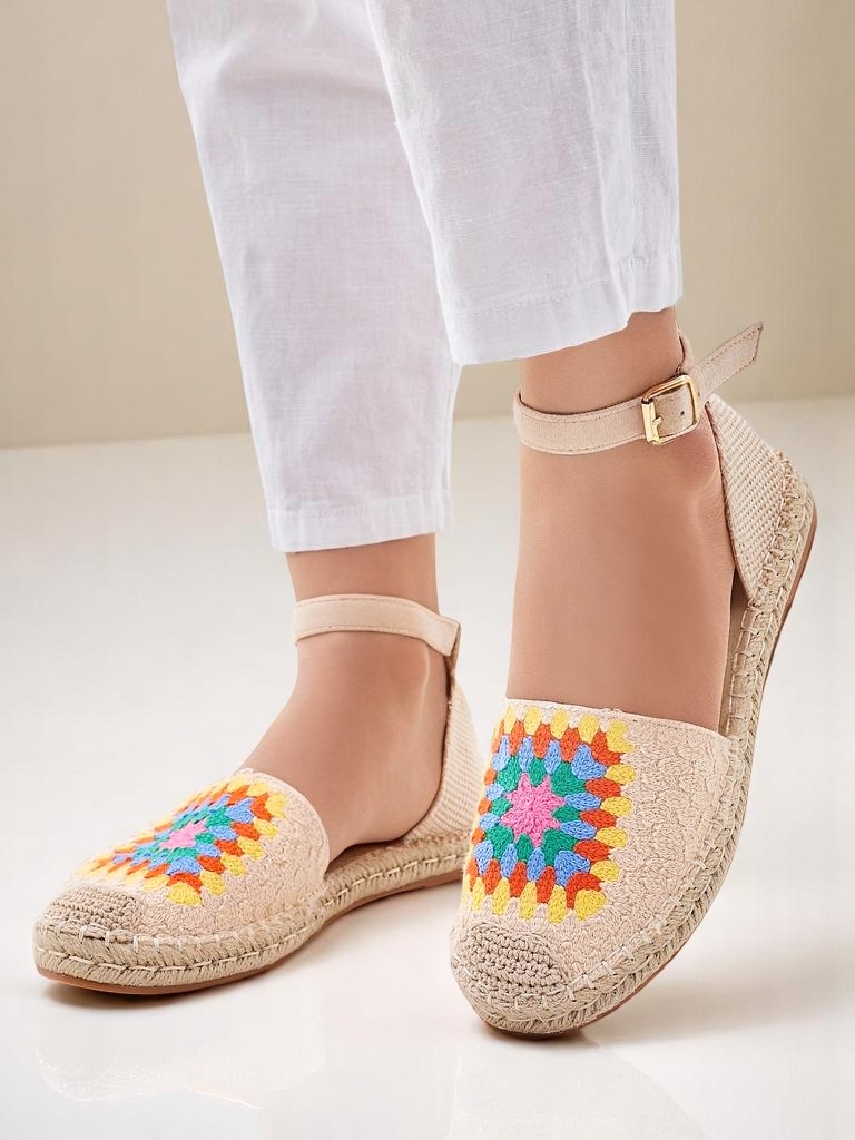 - Espadrile unice pentru femei cu broderie decorativă. Întregul model este fabricat dintr-un material plăcut. Talpa plată decorată cu frânghie din jutate oferă confort. Se fixează cu o cataramă. O adiție perfectă la îmbrăcămintea de vară!