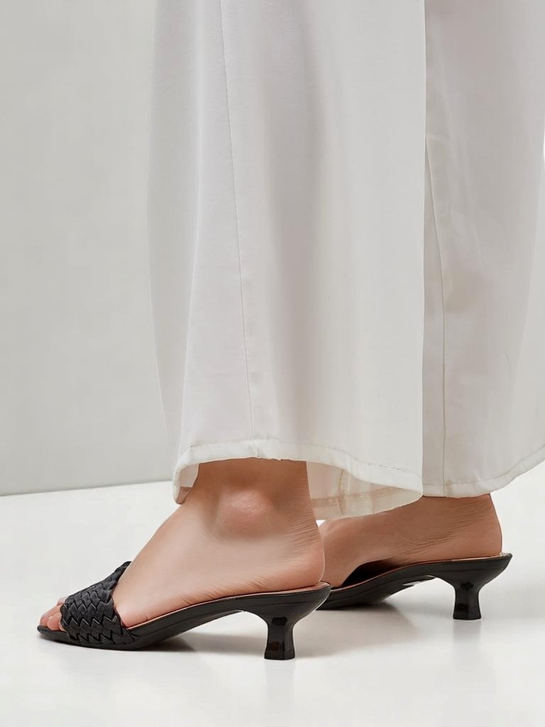 - Unprecedented women's mules made of ecological leather. The strap is clearly decorated with a braid. The mules have a low heel and a square toe. An incredibly original choice!