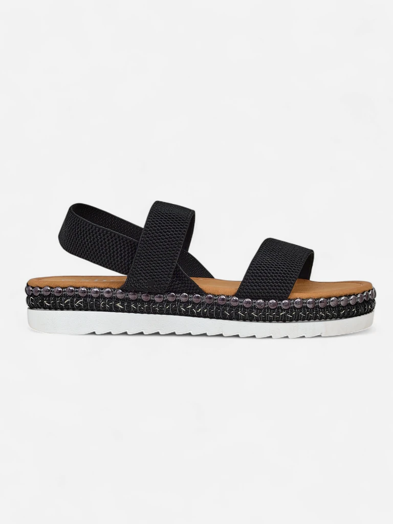 • Sandale pentru femei cu talpă joasă - ideea perfectă pentru zilele călduroase de vară. Modelul este realizat din țesătură și ecopiele. Talpa este decorată cu piulițe decorative. Încălțăminte ușor de purtat. O combinație între stil și confort!