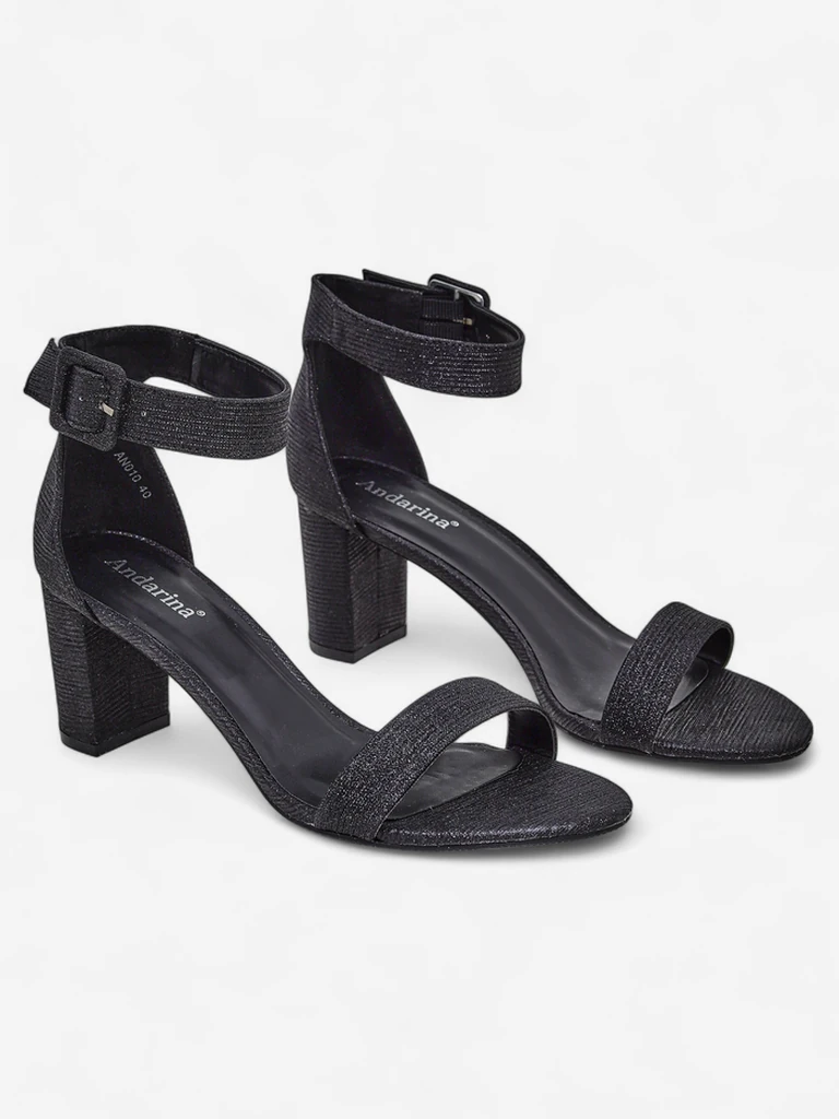 - cu toc bloc - idea perfectă pentru zilele călduroase de vară. Modelul este realizat dintr-un material glitter cu o branț din eco-piele. Pantofii se închid cu o cataramă. O combinație de stil și confort!