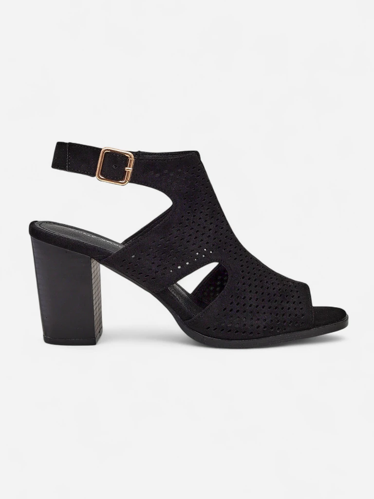 - Sandale cu toc gros și decupaje, cu partea superioară. Sunt confecționate din piele întoarsă ecologică, iar talpa interioară este din piele ecologică. Încălțămintea se încheie cu o cataramă în spate. Perfecte pentru crearea unor ținute de vară la modă!