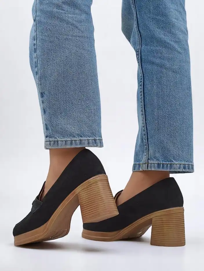 • Mocasini frumoși cu toc bloc pentru femei. Acest model casual este confecționat din piele întoarsă ecologică, cu talpă interioară din piele ecologică. Vârf rotunjit. O bază ideală pentru multe ținute de zi cu zi!