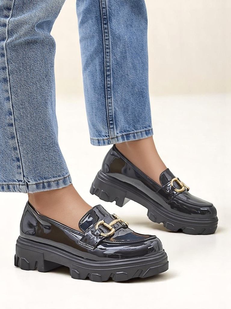 Loafers de damă stilate, confecționate din piele ecologică lăcuită, într-o nuanță elegantă de negru. Acest model se remarcă prin talpa masivă cu crampoane, care oferă confort la purtare și aderență excelentă. În partea din față se află o decorațiune aurie în stil horsebit, care conferă pantofilor un caracter sofisticat. Interiorul este căptușit cu un material moale, pentru un plus de confort. Ideali atât pentru ținute casual, cât și pentru cele mai elegante. O alegere excelentă pentru sezonul toamnă-primăvară.