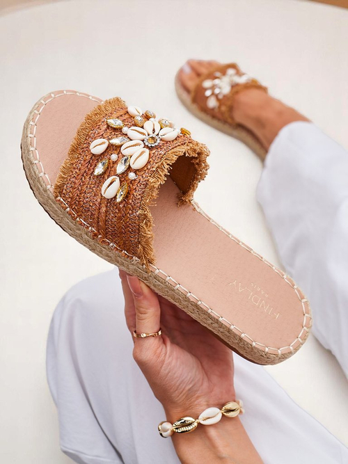 Sandały Royalfashion Callista Boho Camel na płaskiej platformie z muszelkami