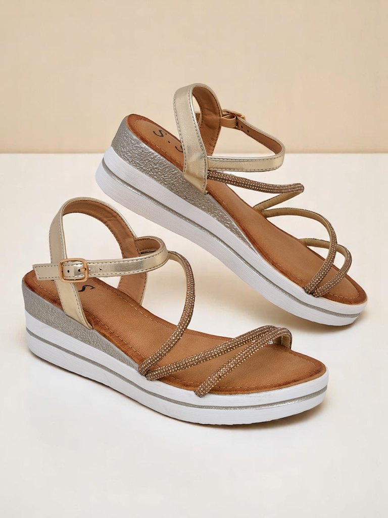 - Descoperiți eleganța cu aceste sandale. Impresionante pe platformă, împodobite cu strasuri strălucitoare, evidențiază perfect strălucirea verii. O combinație de confort și aspect luxos – perfectă pentru orice ocazie specială!