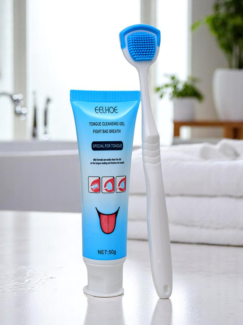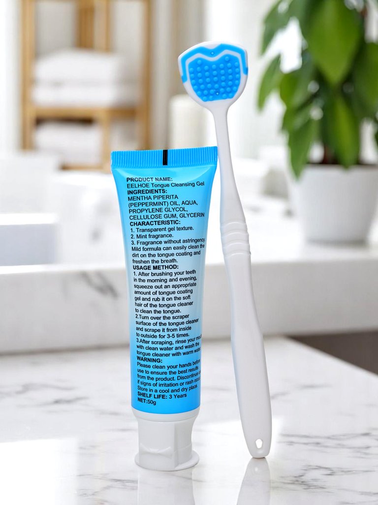 - Gel pentru igiena limbii cu periuță îndepărtează eficient bacteriile, depunerile și mirosul neplăcut, susținând respirația proaspătă și igiena orală completă.