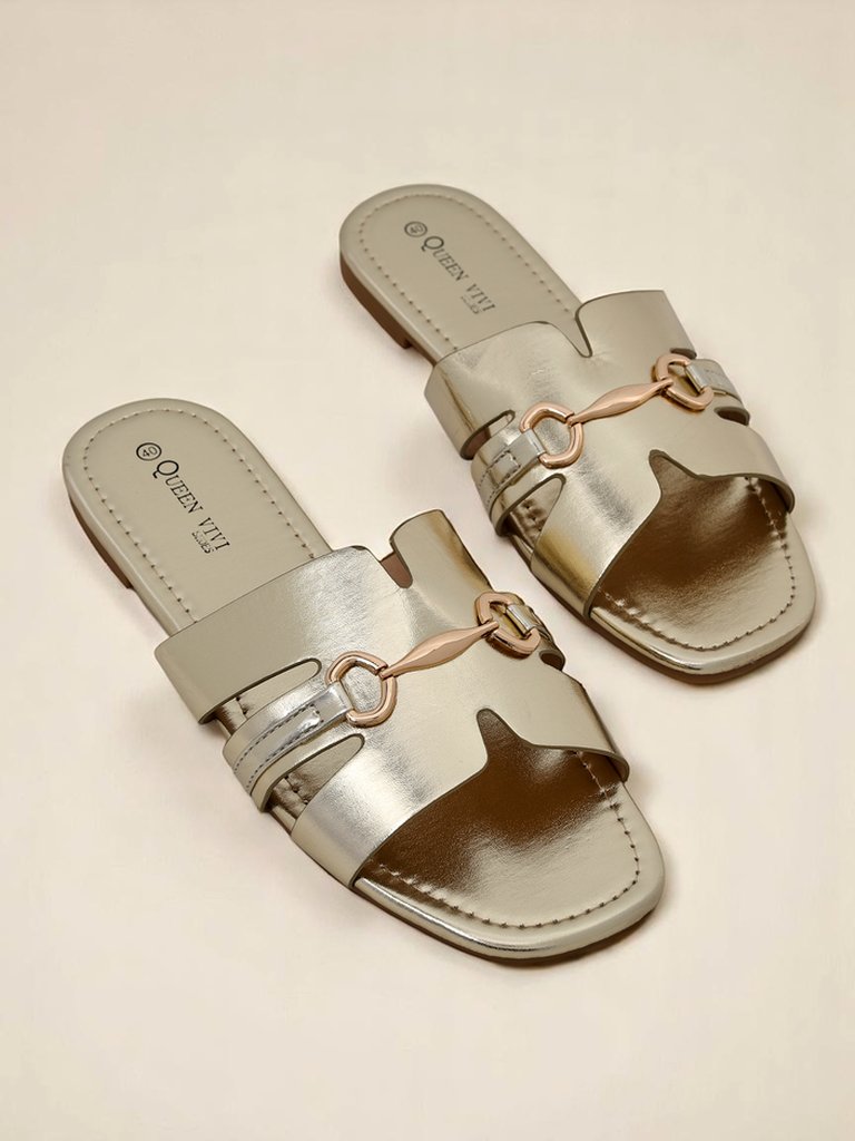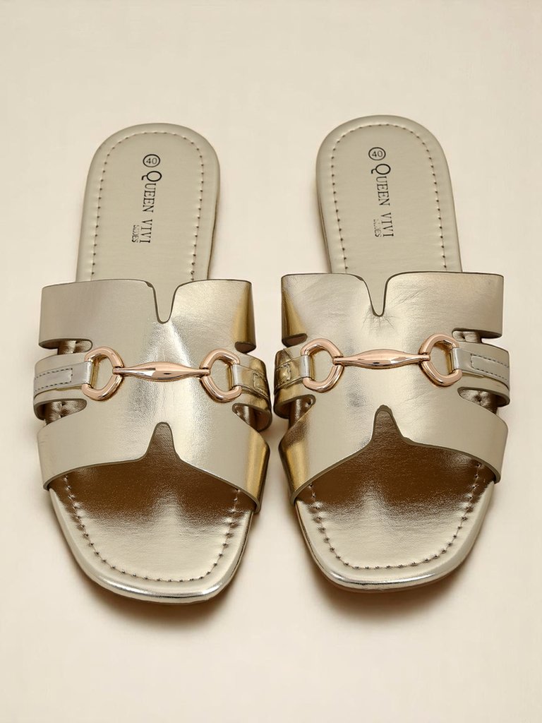 - Papuci din piele ecologică, decorați cu un ornament auriu discret. Simplitate elegantă și confort, perfecți pentru orice ținută de vară.