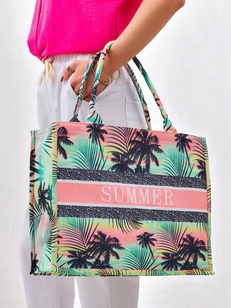 - Geantă mare de plajă din material textil, cu imprimeu colorat și inscripția "SUMMER". Are un compartiment, este ușoară și încăpătoare – perfectă pentru plajă, vacanțe și ținute de vară!