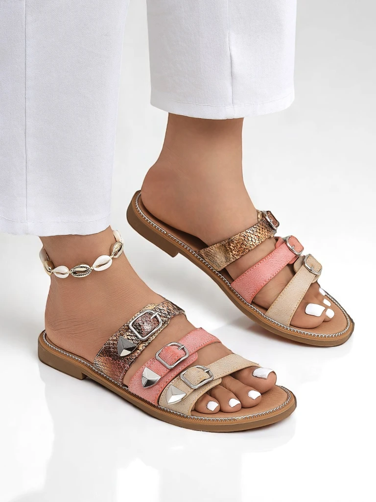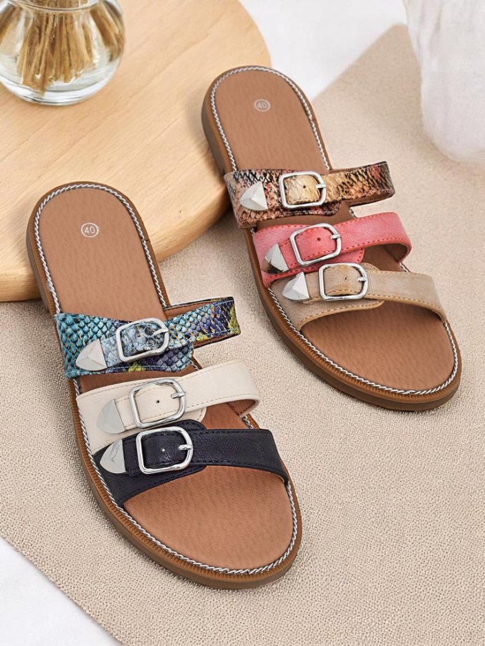 - Plooi slippers gemaak van eko-leer met reliëf en dekoratiewe gespe. Stylvol, gemaklik – perfek vir die somer, die stad en alledaagse stilering!