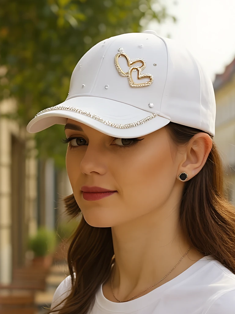 - Șapcă feminină decorată cu pietre strălucitoare în formă de inimi. Elegantă, confortabilă și reglabilă. Adaugă strălucire atât ținutelor de zi cu zi, cât și celor speciale!