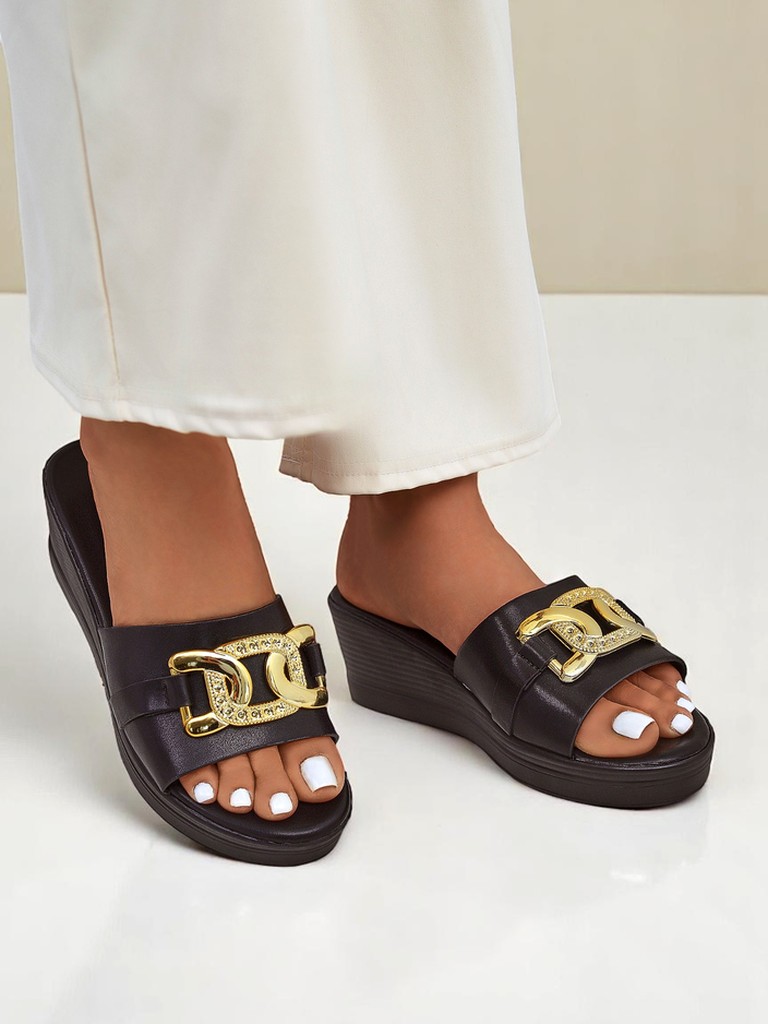• Nolia sunt sandale wedge elegante, confecționate din piele ecologică, cu un finisaj metalic și o decorațiune subtilă aurie. Perfecte pentru vară – combină eleganța cu confortul de zi cu zi.