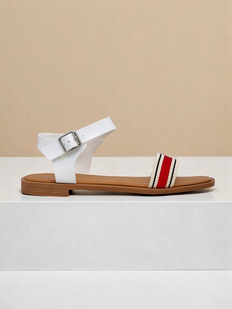 - Sandale elegante cu talpă joasă, confecționate din piele ecologică moale. Banda textilă oferă lejeritate, iar catarama asigură o potrivire confortabilă pentru fiecare zi.