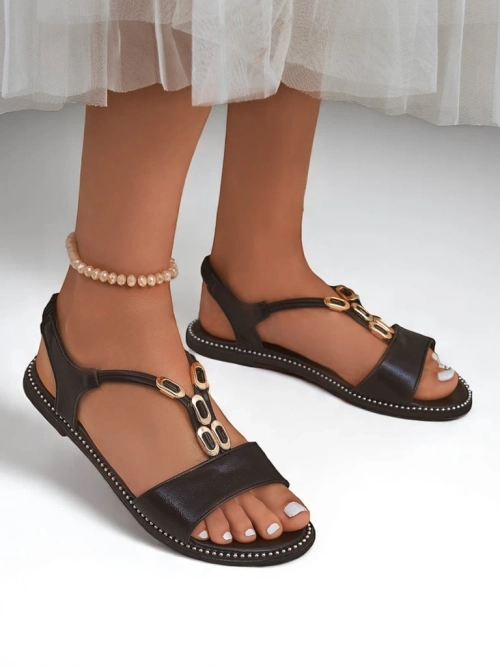- Dameslippersandale gemaak van eko-leer op 'n plat sool, versier met elegante bandjies. Gerief en styl vir alledaagse en somerstap.
