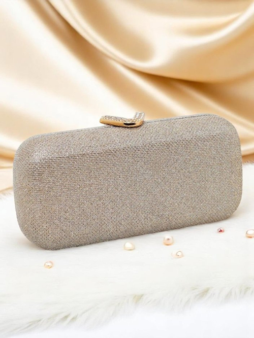 - Poșetă plic confecționată din piele ecologică acoperită cu material textil lucios, cu embosare delicată. Se închide cu capse, are lanț detașabil — perfectă pentru o seară elegantă.