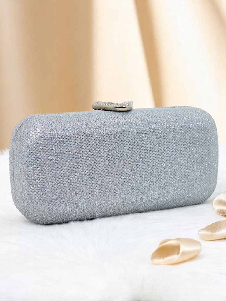 - Poșetă plic confecționată din piele ecologică acoperită cu material textil lucios, cu embosare delicată. Se închide cu capse, are lanț detașabil — perfectă pentru o seară elegantă.