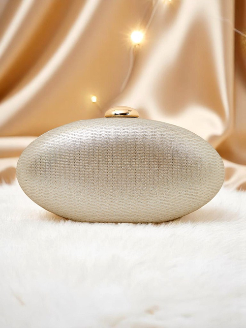 - Geantă tip plic, în formă de elipsă, confecționată din piele ecologică, acoperită cu material textil cu fir strălucitor și emboss. Se închide cu capsă, are lanț detașabil – stil și strălucire!