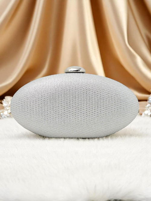 - Geantă tip plic, în formă de elipsă, confecționată din piele ecologică, acoperită cu material textil cu fir strălucitor și emboss. Se închide cu capsă, are lanț detașabil – stil și strălucire!