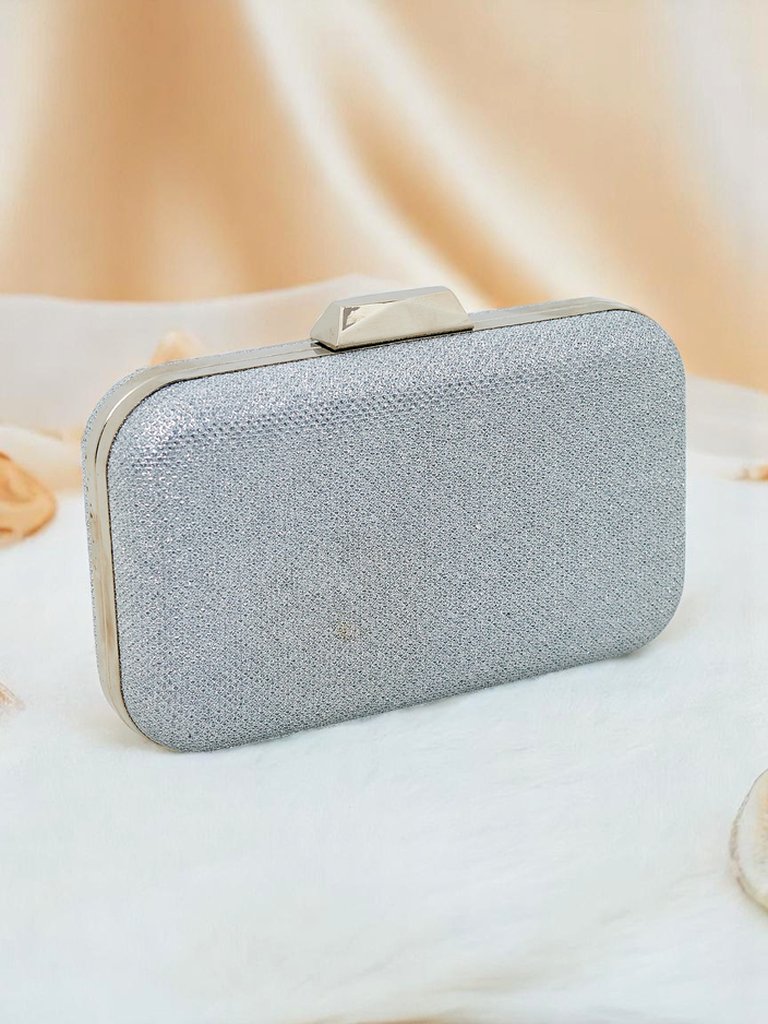 - Geantă plic confecționată din piele ecologică, acoperită cu material textil cu fir strălucitor și emboss subtil. Se închide cu capse, are un lanț detașabil—eleganță cu un strop de sclipire.