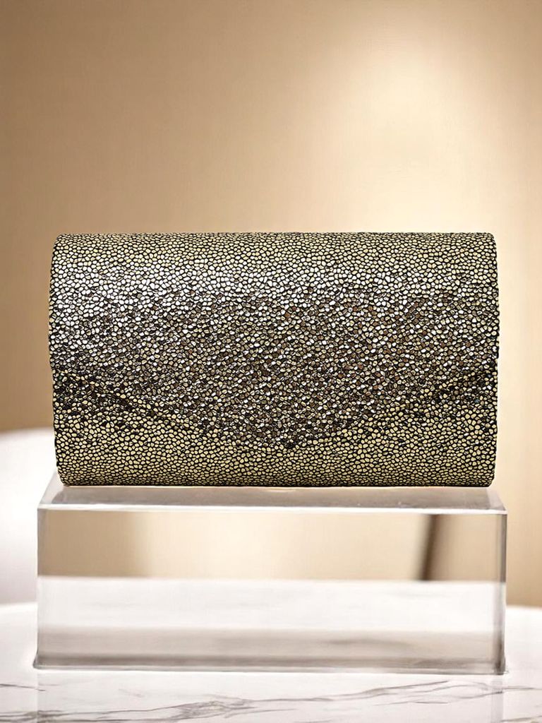 - Geantă clutch strălucitoare, realizată din piele ecologică acoperită cu sclipici gros. Se închide cu magnet, are o curea detașabilă—perfectă pentru o seară plină de glamour și stil.