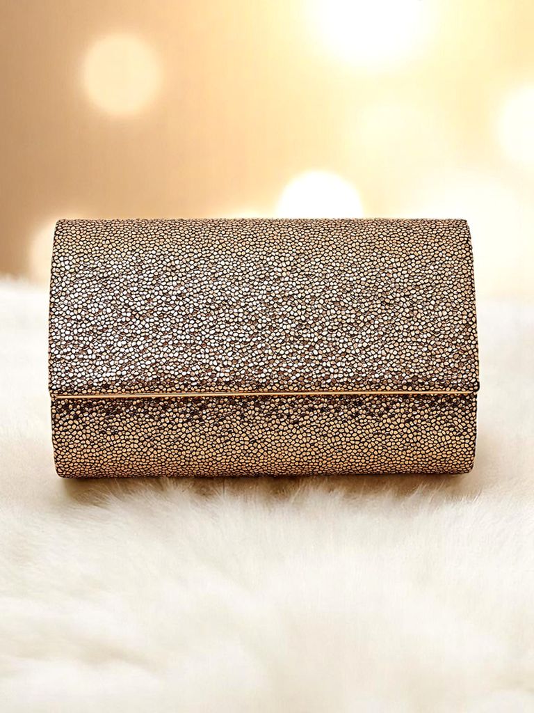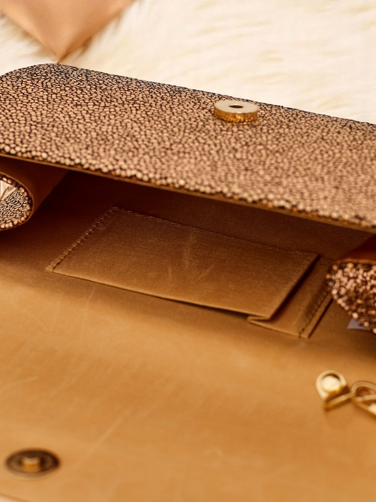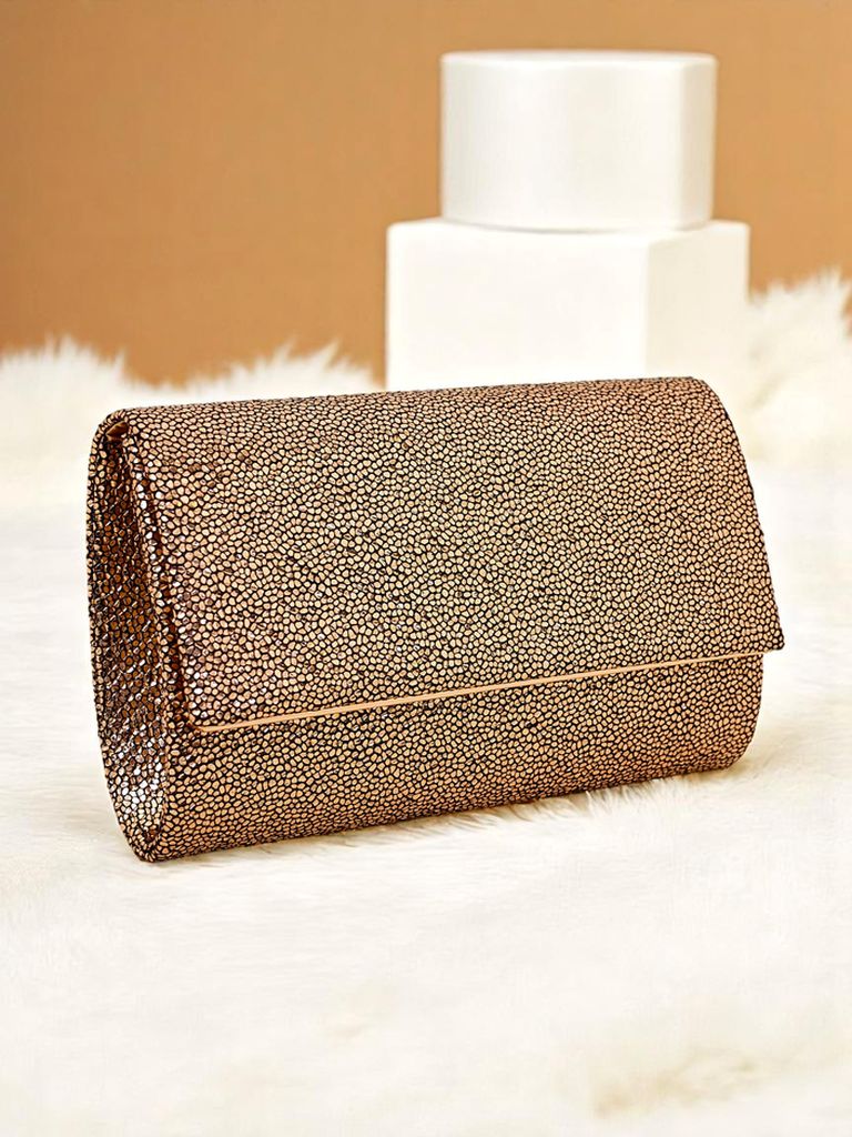 - Clutch elegant confecționat din piele ecologică, acoperit cu material gros cu sclipici. Se închide cu magnet, are curea detașabilă – perfect pentru ieșiri de seară și ocazii speciale.