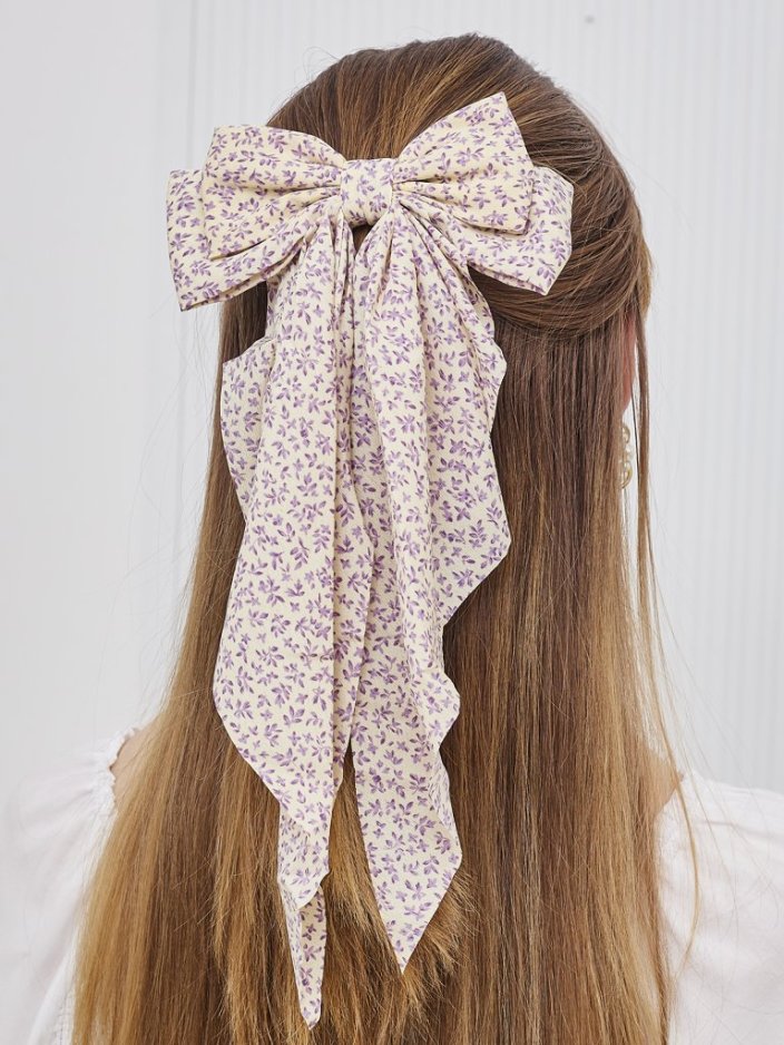 - Agrafă de păr cu fundă și panglici lungi cu floricele. Un accesoriu delicat și romantic ce evidențiază frumos coafura, adăugând lejeritate și prospețime oricărui look.