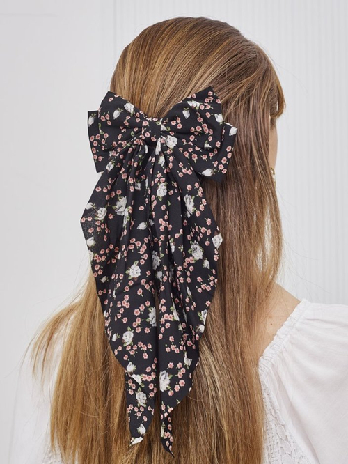 - Agrafă de păr cu fundă și panglici lungi, cu model floral. Un accesoriu delicat și romantic care evidențiază frumos coafura, adăugând lejeritate și prospețime oricărei ținute.