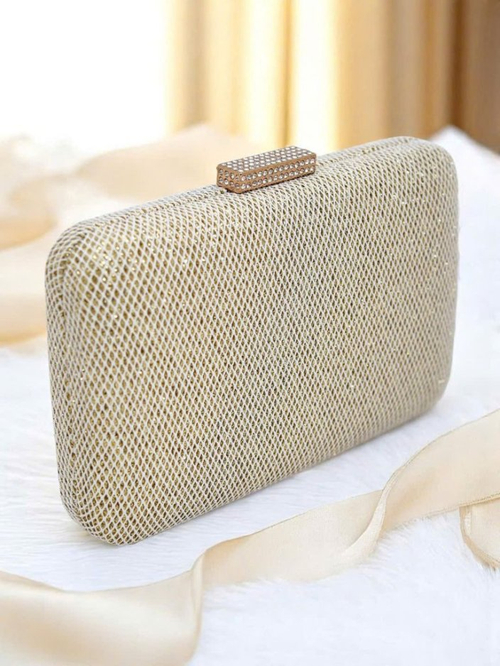 - Geantă tip plic confecționată din piele ecologică, acoperită cu material textil cu fir strălucitor și emboss subtil. Se închide cu capse, are un lanț detașabil — eleganță și strălucire într-un singur accesoriu.