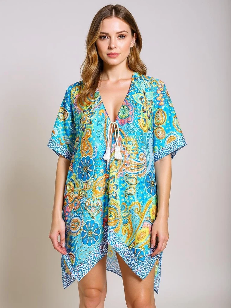 - O tunica de plajă tip pareo cu gât în V și tiv asimetric este un must-have elegant pentru vacanță. Țesătura vaporoasă, ușoară și modelul atrăgător îți accentuează feminitatea, iar croiala lejeră asigură confort în zilele toride. Ideală pentru plajă și pli
