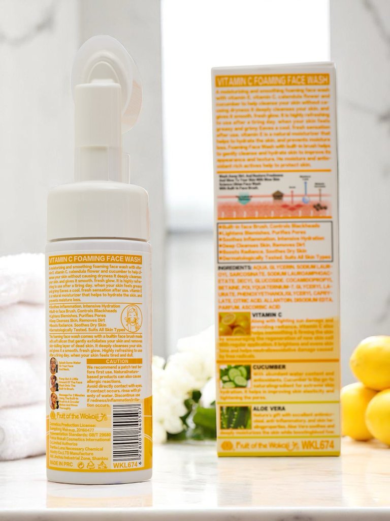 - Spumă purificatoare pentru față cu vitamina C și perie. Îndepărtează delicat impuritățile, iluminează pielea și are proprietăți anti-îmbătrânire, lăsând tenul proaspăt, neted și radiant.