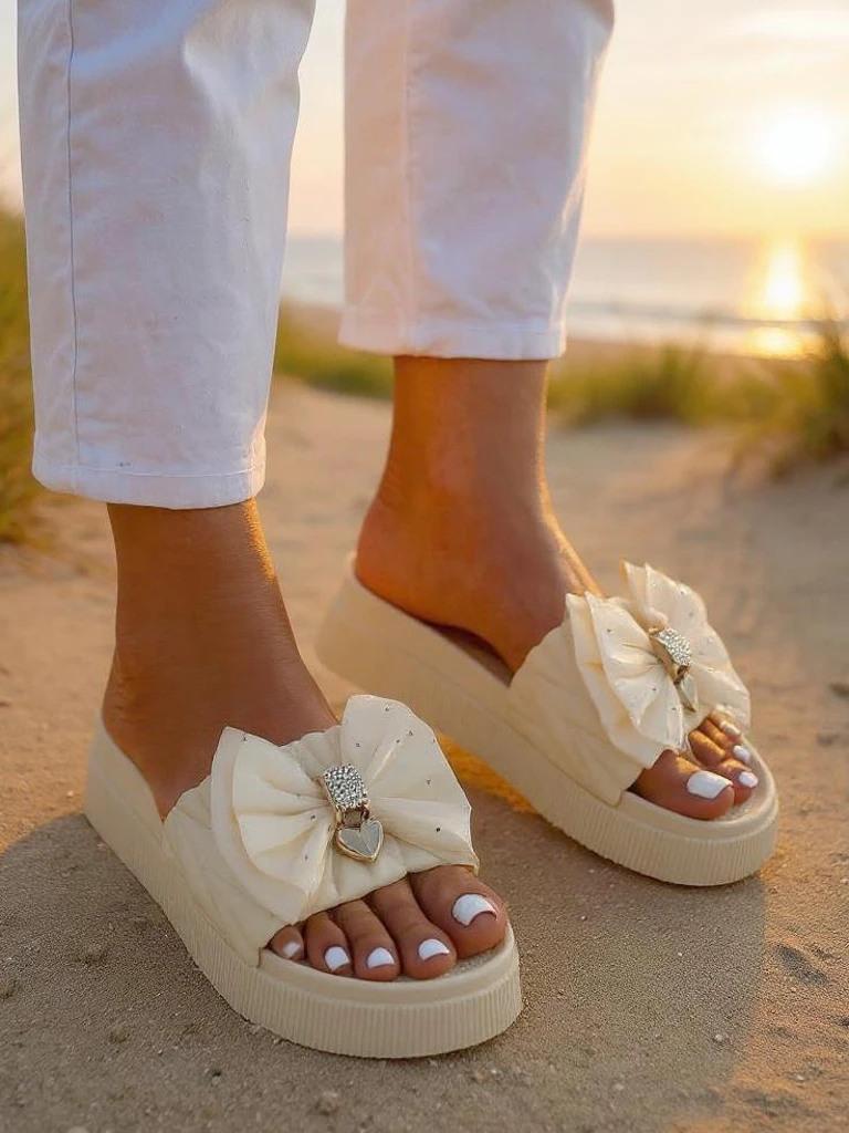 Florensis Bella ta klapki elegante pa damas riba plataforma, den kolornan krem ku un lolo grandi ku aplikashon. Parti ariba di material tekstil, plantia i suela di material EVA – konfort i levedad. Anti-slip, resistente na humedad i fasil pa limpia. Suela haltu ta hasi e pianan mas largu, plantia suave ta garantisá konfort. Lolo riba e strepi ta stabilisá e pia i ta añadí elegancia – elemento di joya ku kristal i kurason. Stilisashonnan: 1. Romantiko: bistí maxi of saya i blusa. 2. Urbano: short di denim i T-shirt. 3. Di playa: pantalon palazzo i top. Florensis Bella ta pas den e tendensianan ‘girly chic’ i ‘pastel soft’. Limpiesa: paña húmedo. Sehá den sombra. Warda na un lugá seku. Florensis Bella ta konfort, estilo i tendensia – perfekto pa verano.