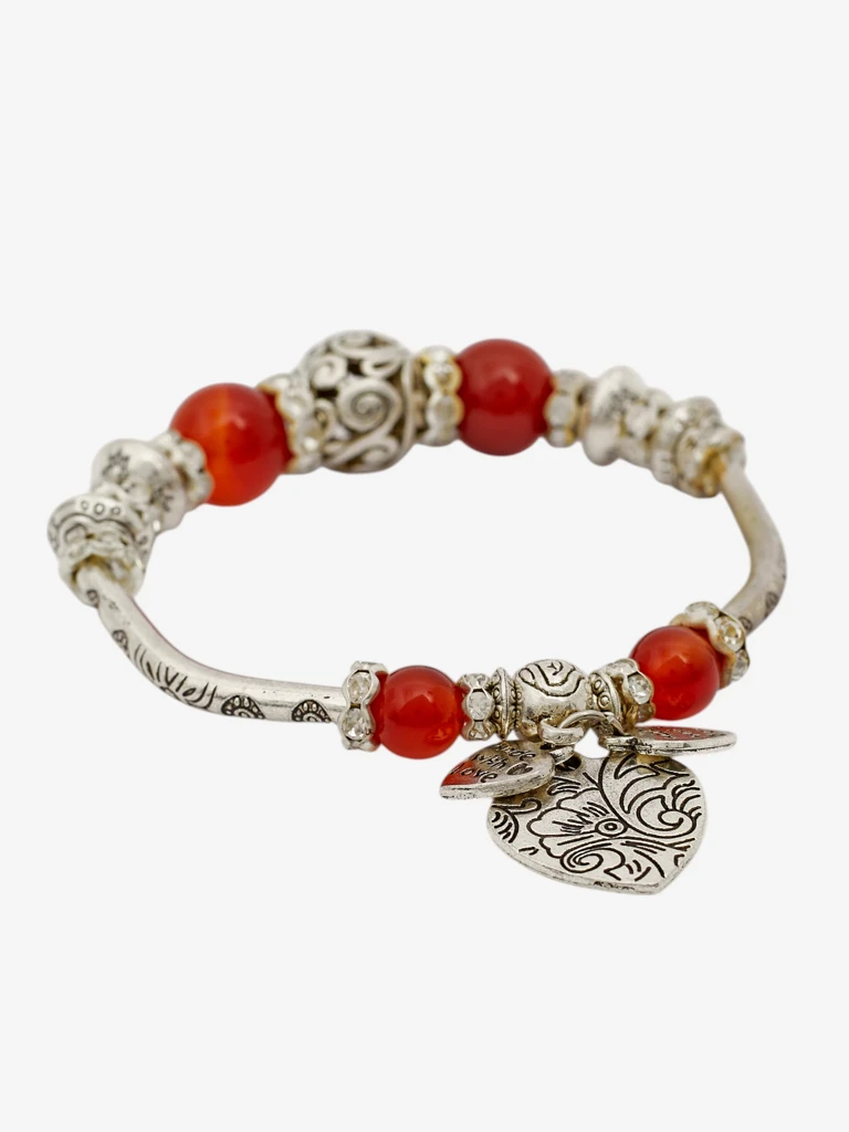 - O brățară feminină pe bandă elastică, decorată cu cristale, mărgele și pietre din zirconiu cubic. Talismanele în formă de inimă adaugă farmec brățării. Ușoară, confortabilă și plină de strălucire – perfectă ca un cadou sau pentru o ținută romantică.
