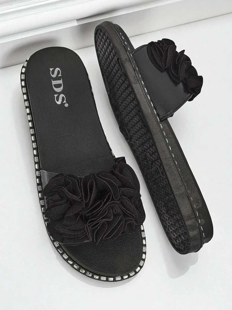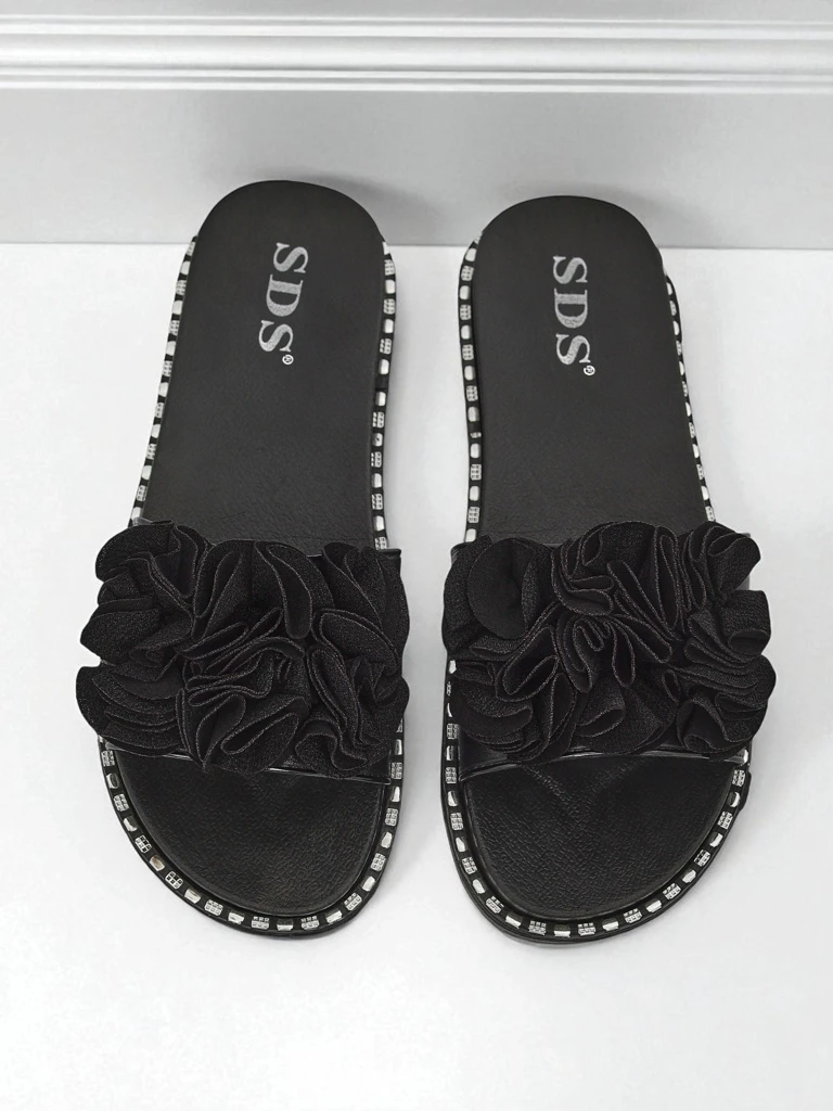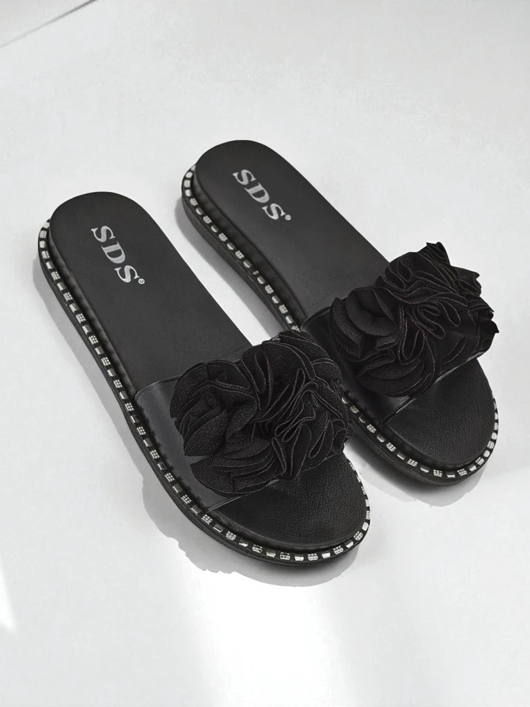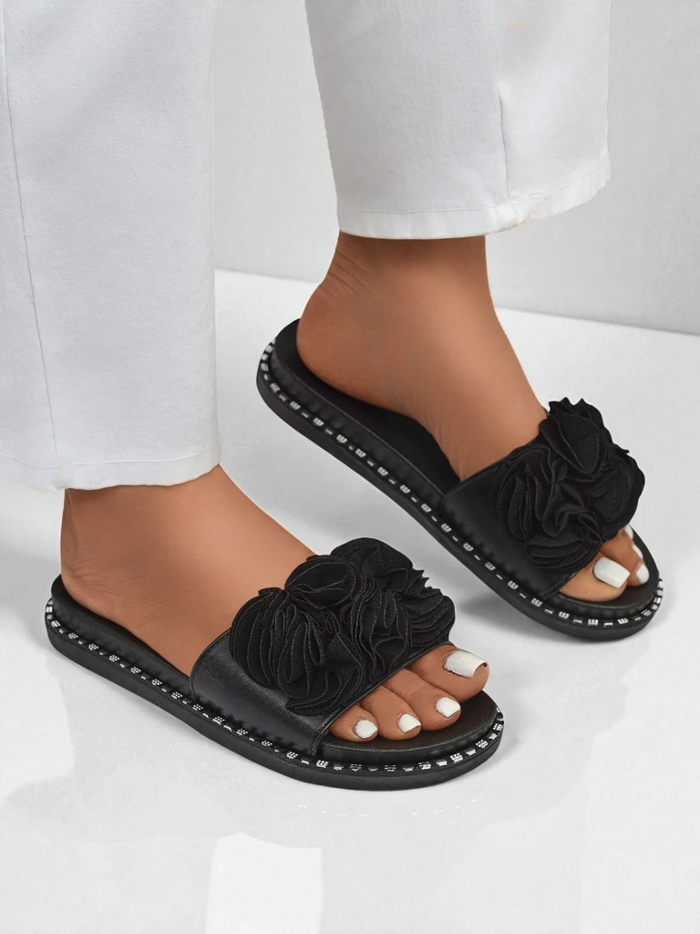 - Papuci de damă din piele ecologică, cu un accesoriu floral la modă. O opțiune ușoară, confortabilă și elegantă pentru vară – eleganță ecologică pentru purtarea de zi cu zi!