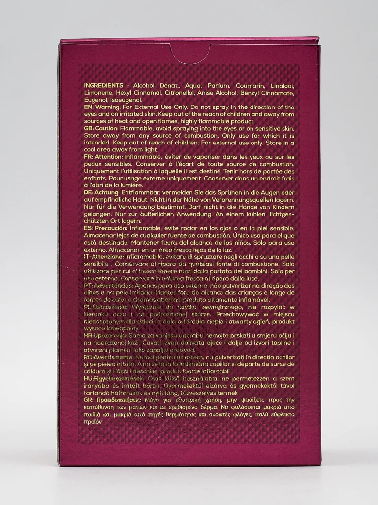 - Parfum distinctiv și senzual care se deschide cu note de migdală amară, lichior și cireșe zemoase. În inima sa, acorduri de prună, trandafir și iasomie înfloresc, evoluând într-o bază profundă și picantă cu vanilie, boabe tonka, lemn și condimente.