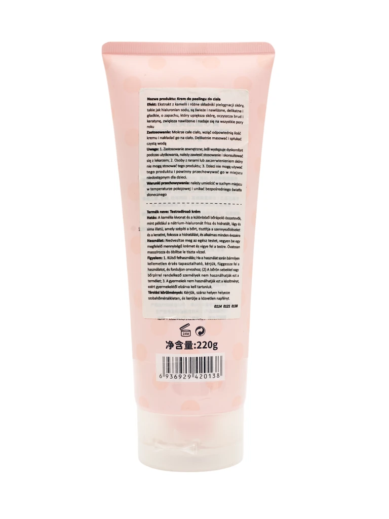 - ELENCE scrub de corp cu extract de camelie și acid hialuronic – hidratează, netezește, revigorează.
