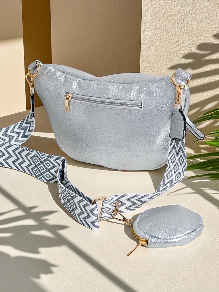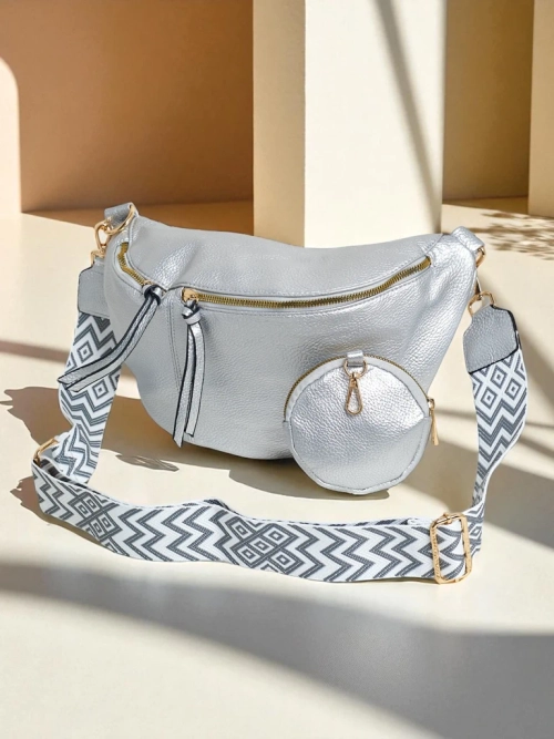 - Geantă de damă stilată, mică, cu formă semi-circulară, confecționată din piele ecologică. Un compartiment, buzunar exterior, curea detașabilă și reglabilă, și portfard atașabil. Eleganță funcțională pentru fiecare zi.