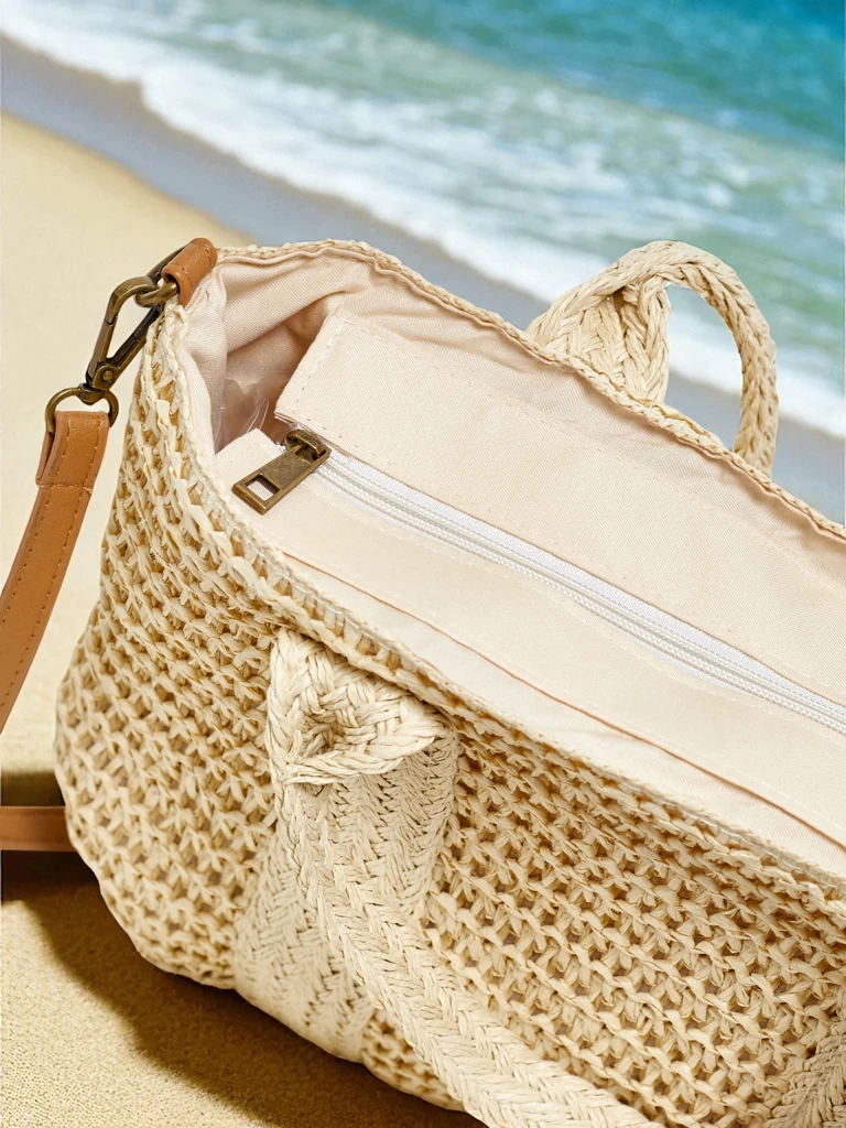 - Geantă de paie elegantă, cu un singur compartiment și un buzunar, închisă cu fermoar. Ușoară și încăpătoare, ideală pentru zilele de vară. Perfectă pentru ținute casual, oferă confort și organizare, menținând în același timp un farmec modern și de vacanță