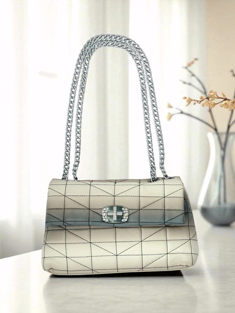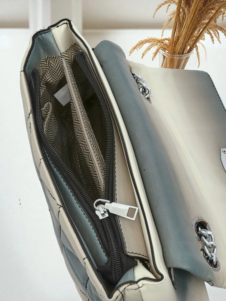 - Poșetă elegantă tip plic, realizată din piele ecologică cu efect ombre. Se închide cu fermoar și capsă. Un lanț metalic în loc de curea adaugă un plus de rafinament. 1 compartiment, perfectă pentru cele mai importante lucruri pentru o ieșire de seară sau