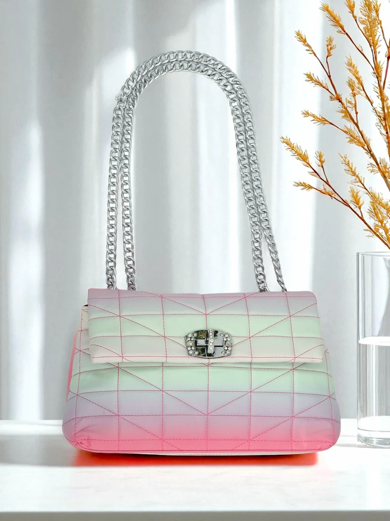 - Poșetă elegantă tip plic, realizată din piele ecologică cu efect ombre. Se închide cu fermoar și capsă. Un lanț metalic în loc de curea adaugă un plus de rafinament. 1 compartiment, perfectă pentru cele mai importante lucruri pentru o ieșire de seară sau