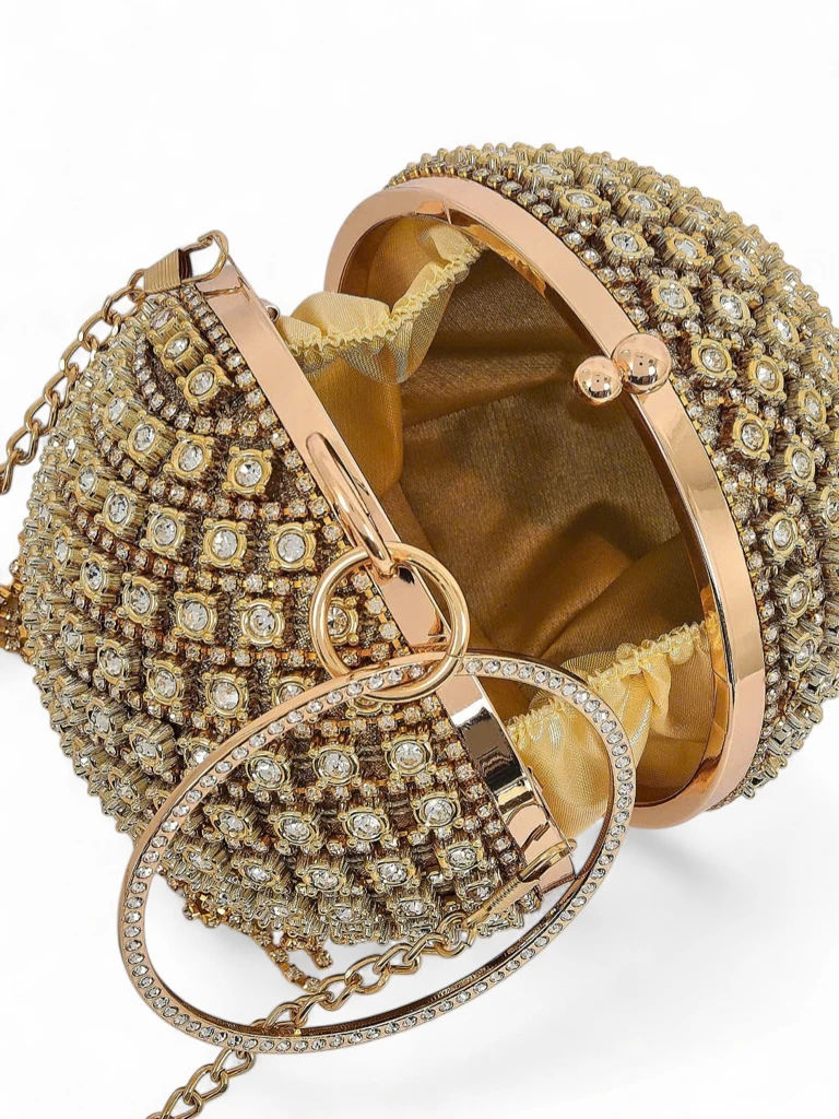 - Kulista kopertówka błyszcząca cyrkoniami i eleganckim łańcuszkiem na ramię. Perfekto na wieczorne wyjścia - robi wrażenie i pasuje do każdej stylizacji.